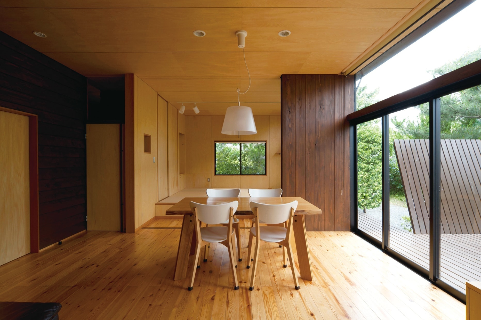 屋内と屋外をつなぐ杉板の壁
