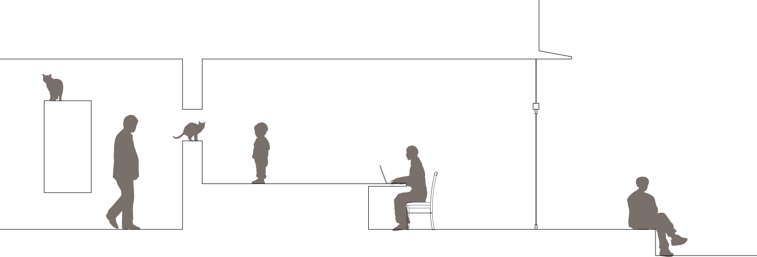 壁の配置や開口部を再構築し、それぞれの場所の気配を感じられるような空間構成としています。