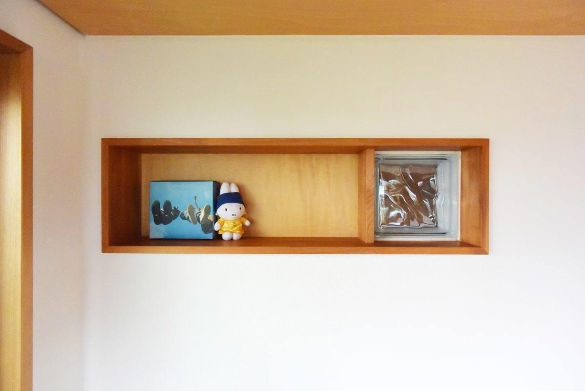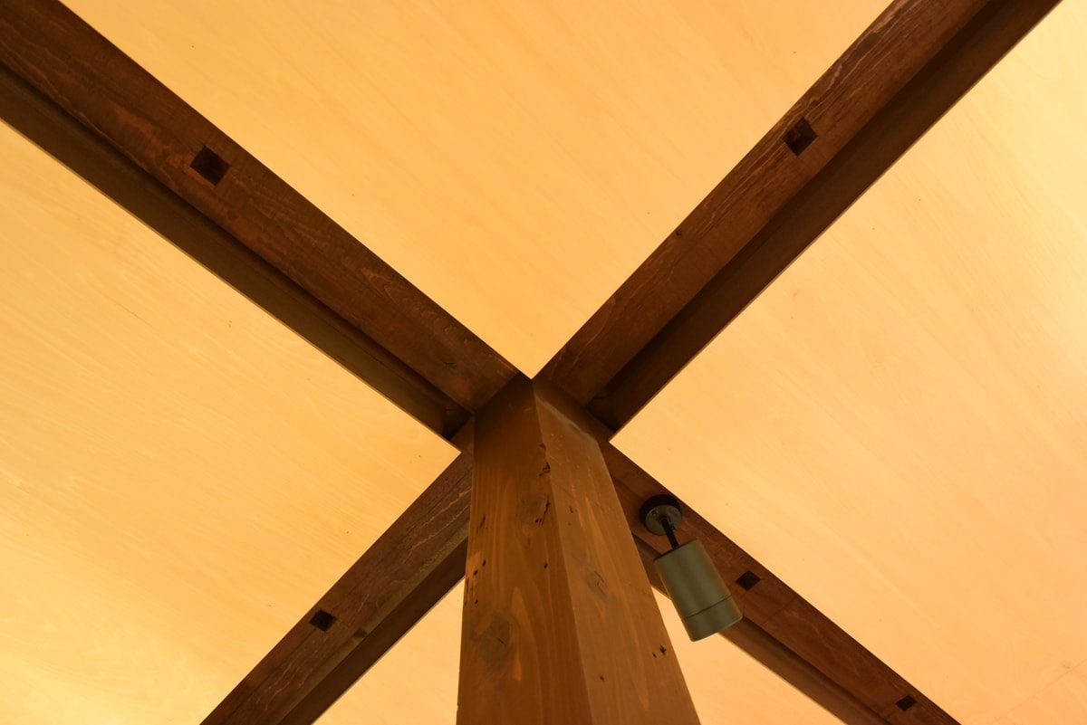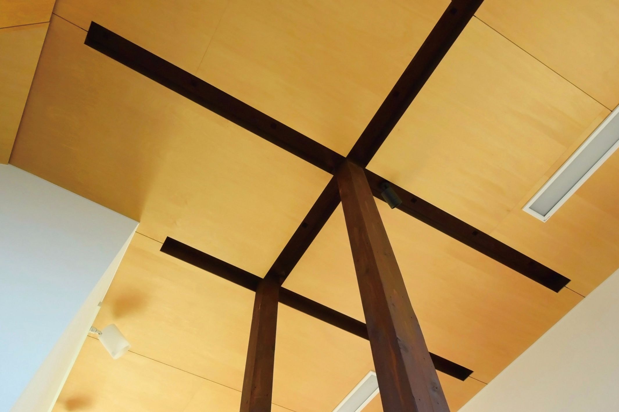 間仕切りがあった場所には天井にスリットを設け、隠れていた既存の梁や柱などを露出しています。新たに天井はシナ合板、壁は白いクロスで仕上げ、既存の木部構造材と対照的な