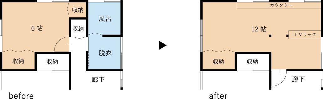 「バスルーム、洗面室、洋室、収納、廊下」の壁や天井、床などを撤去しワンルームに再構成しています。
