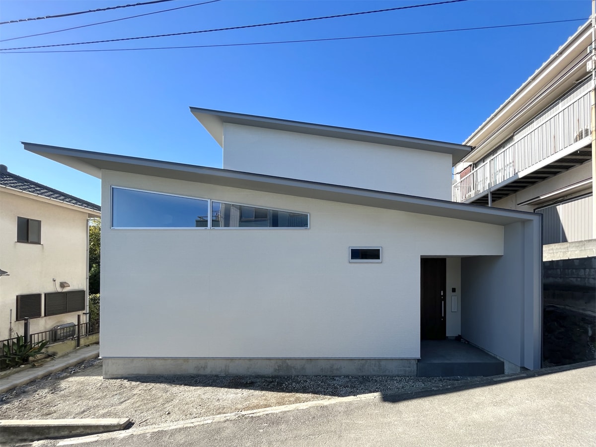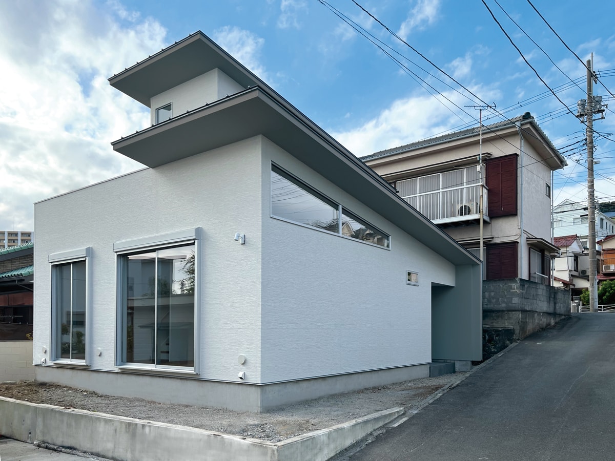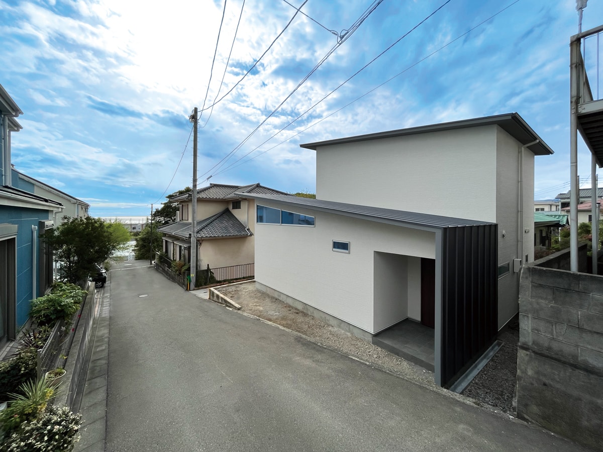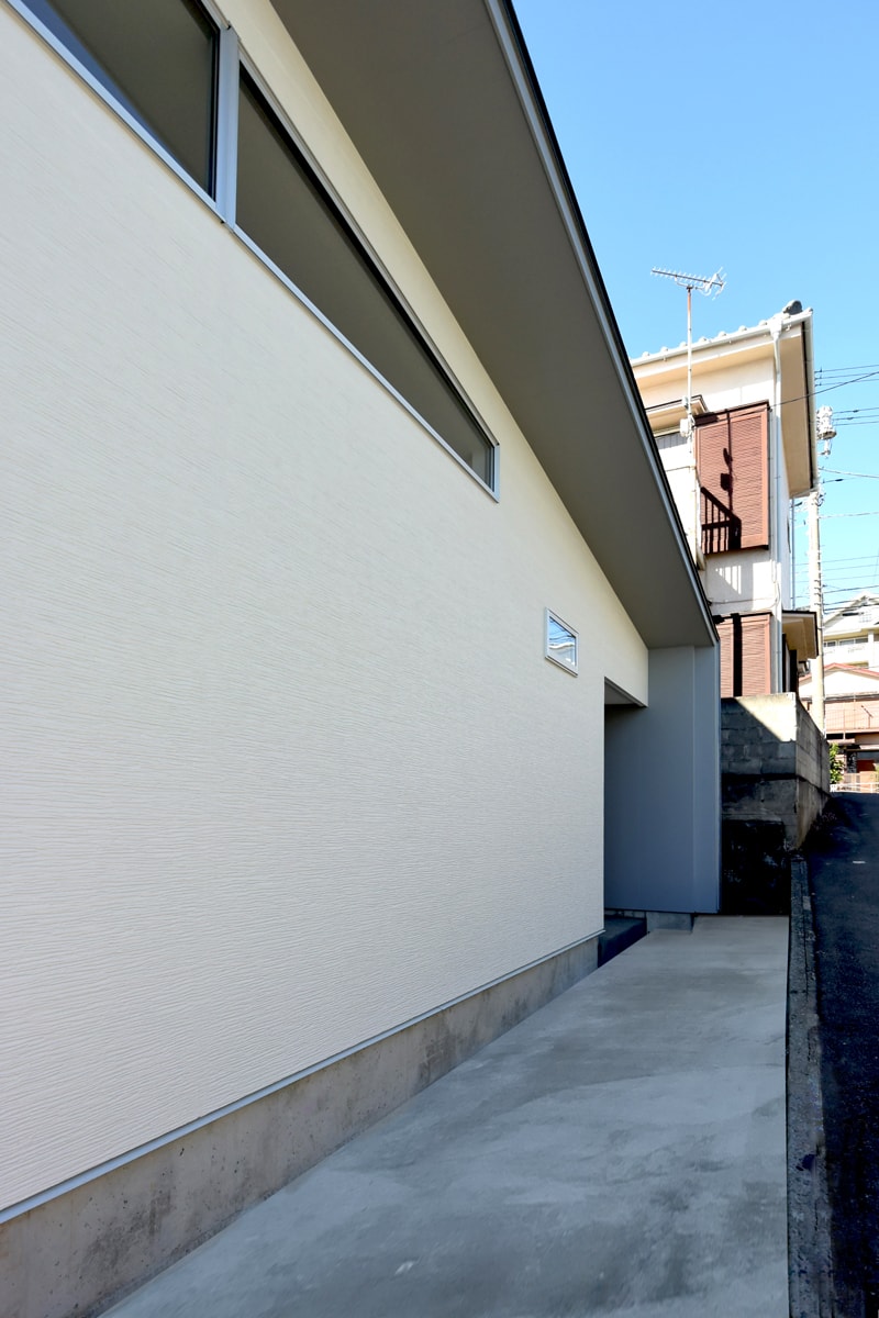 低層部の屋根は玄関付近で垂直に折れ曲がり、壁へと形状を変えながら隣地からは視線を遮り、アプローチ側は人を迎え入れるようなファサードを構成しています。