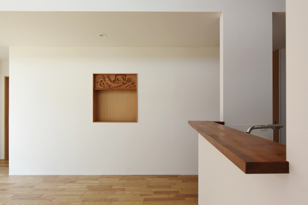 室内には施主が旧家屋にて大切に保管していた「仏壇の欄間」と「洗い張り板」を新たな空間に組み込む事で、『今までと、これからの想い出』が調和する思い入れのある空間を目指しています。