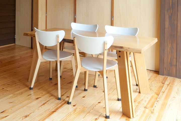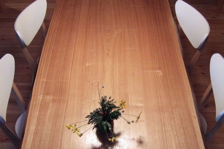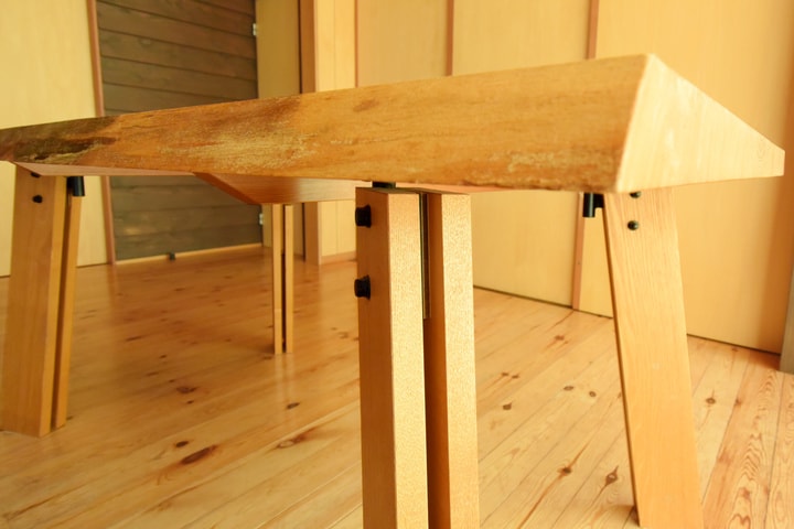 天板をタモ材の耳付き集成板で制作したテーブルです。一般的に流通している集成板とは異なり、一枚板の様に見えるローコストな材料です。